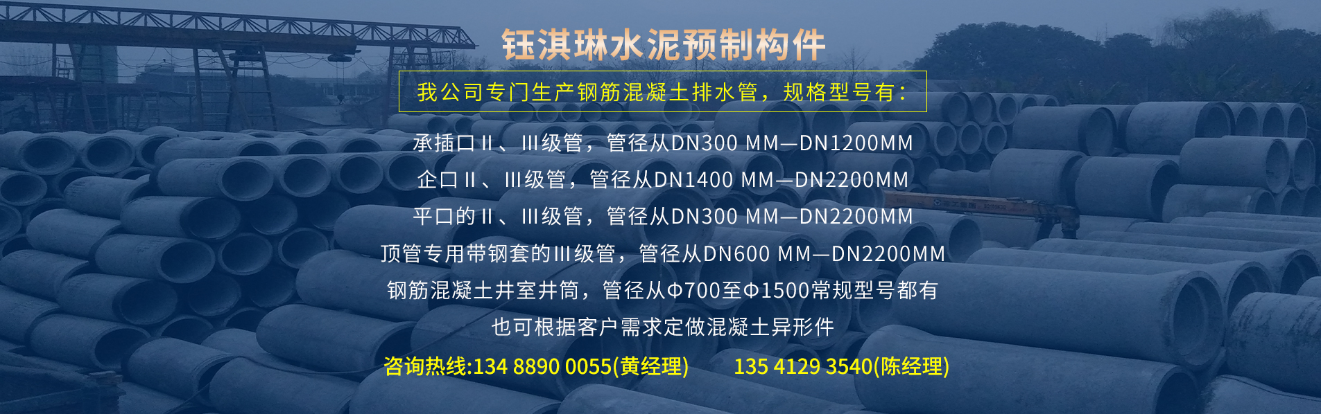 我公司專(zhuān)門(mén)生產(chǎn)鋼筋混凝土排水管,規(guī)格型號(hào)有: 承插口Ⅱ、Ⅲ級(jí)管,管徑從DN300 mm—DN1200mm 企口Ⅱ、Ⅲ級(jí)管,管徑從DN1400 mm—DN2200mm 平口的Ⅱ、Ⅲ級(jí)管,管徑從DN300 mm—DN2200mm 頂管專(zhuān)用帶鋼套的Ⅲ級(jí)管,管徑從DN600 mm—DN2200mm 鋼筋混凝土井室井筒,管徑從Φ700至Φ1500常規(guī)型號(hào)都有 也可根據(jù)客戶(hù)需求定做混凝土異形件。 各型管道日產(chǎn)量可達(dá)400米。本公司產(chǎn)品生產(chǎn)從進(jìn)料——拌料——輸入模具全部電腦...